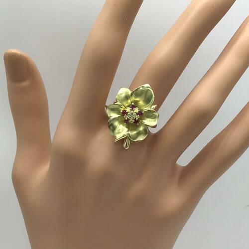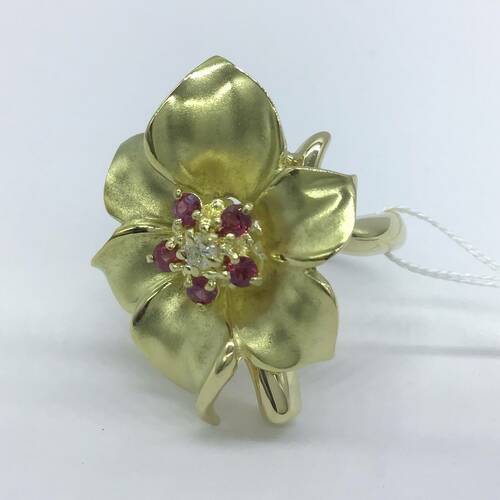 | コメント | 一輪の花のモチーフがとても可愛らしいリングです。真ん中にはルビーとダイヤモンドが施されています。 |