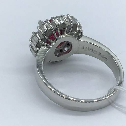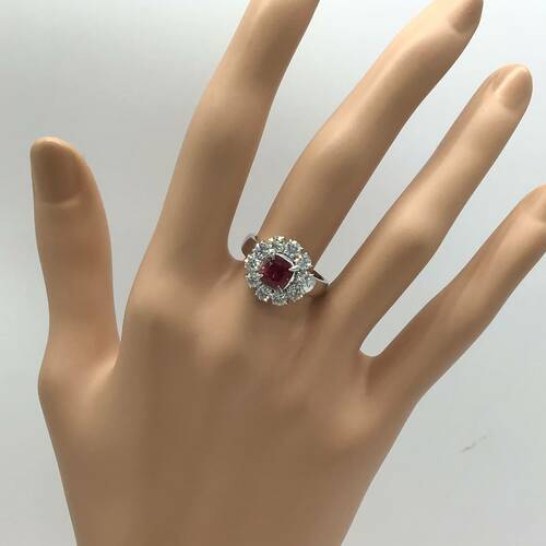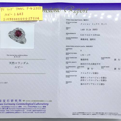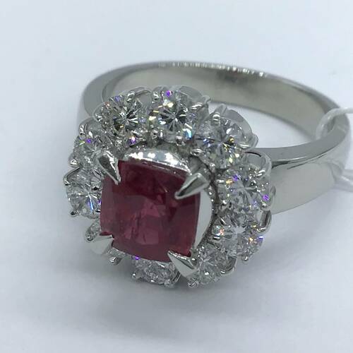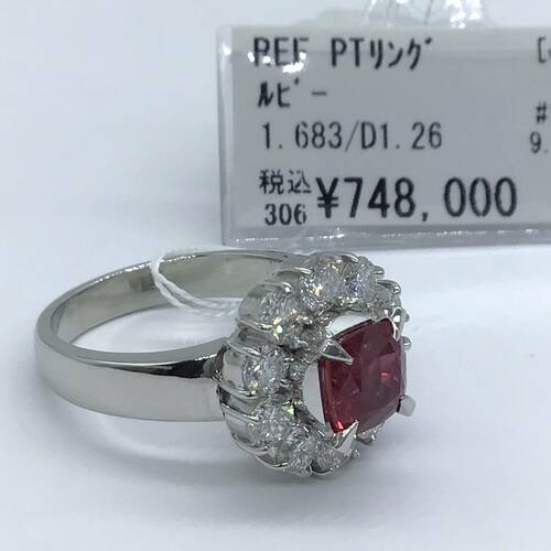 | コメント | 7月誕生石のルビーは結婚40周年記念石でもありあす。1.683キャラットのルビーを囲むように花びらのようにダイヤモンド施されている豪華で可愛らしさもあるリングです。鑑別書付き。 |