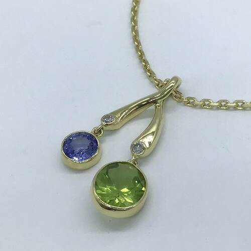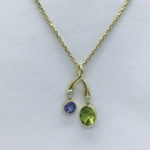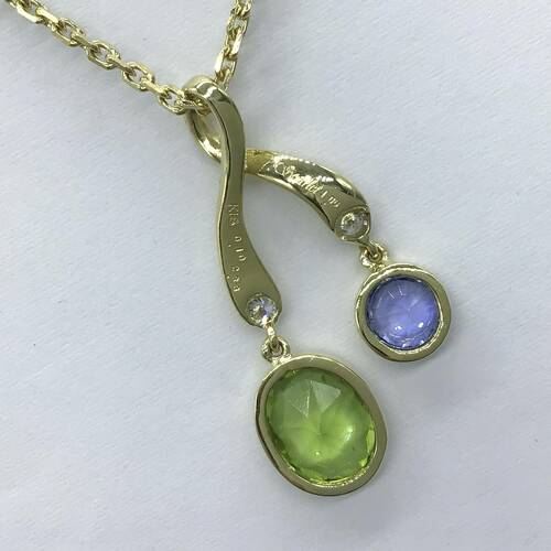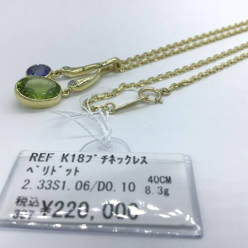 | コメント | 2.33キャラットの8月誕生石のペリドットがさくらんぼのようなデザインで可愛らしいネックレスです。 |
