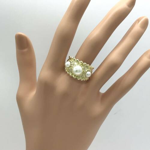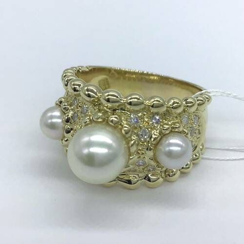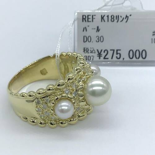 | コメント | 6月誕生石のパールは結婚30周年記念石でもあります。大小パールが3石、回りにダイヤモンドが敷き詰められた豪華なリングです。 |
