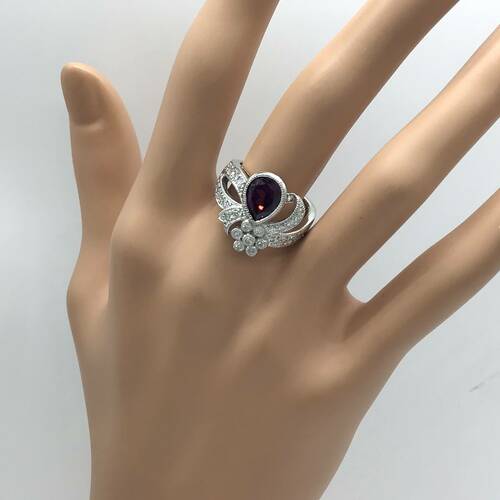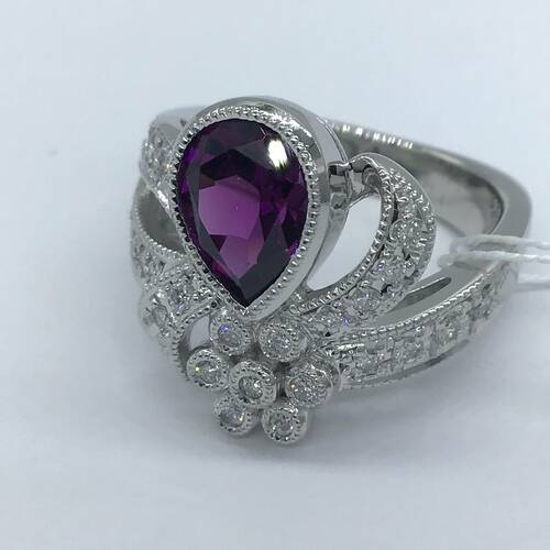 | コメント | 1月誕生石のガーネットは, 結婚18年目の記念石でもあり、変わらない絆の証としてガーネットを送ると言うのも素敵です。雫型のガーネットをプレゼントするようにリボンのデザインが可愛らしさがあります。また回りにダイヤモンドが豊富に施され豪華さもあるリングです。 |