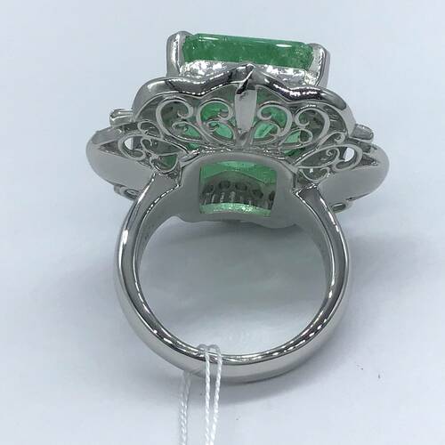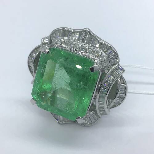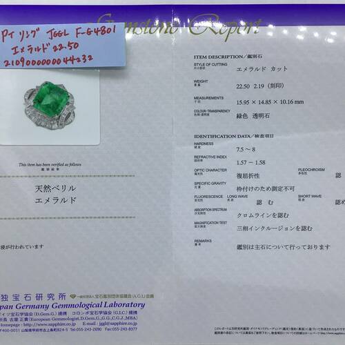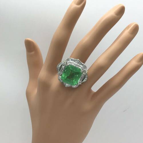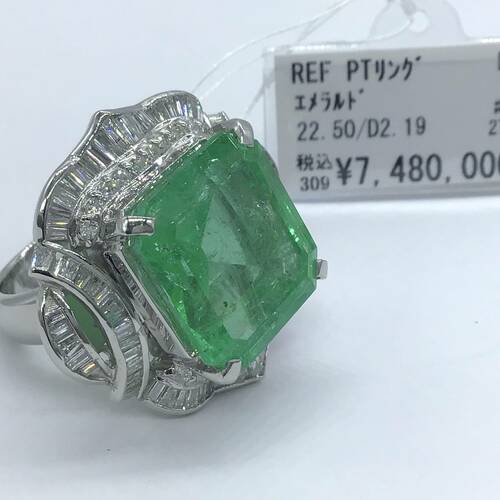 エメラルドが驚きの22.50キャラットとダイヤモンドも豊富に施された重量感、存在感のあるリングです。鑑定書付き。