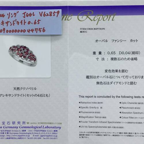 | コメント | 6月誕生石のアレキサンドライトは、陽の光下では深いフォレストグリーンの色ですが、夜白熱灯の下では艶めいた輝きを放つバーガンディに変化します。アレキサンドライトとダイヤモンドが散りばめられた豪華なリングです。鑑別書付き。 |