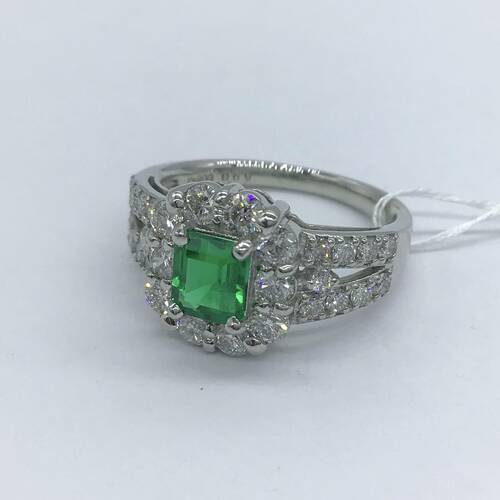 5月誕生石のエメラルドに回りと両サイドにも豪華にダイヤモンドが施され、美しい輝きが映えるリングです。鑑別書付き。