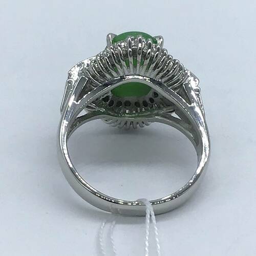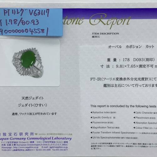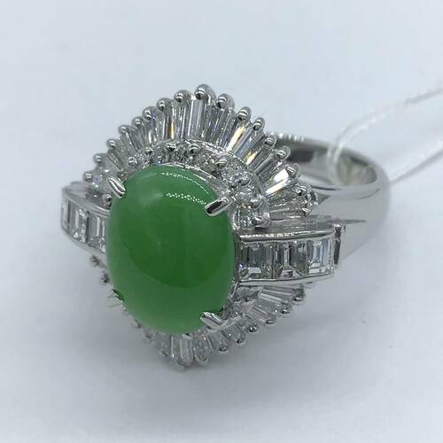 5月誕生石ヒスイが1.78キャラットと、回りにはダイヤモンドが放射線状に施された、輝きが美しいリングです。鑑別書付き。
