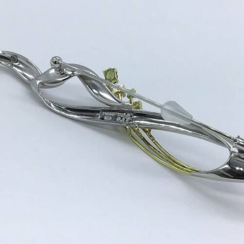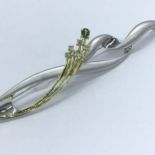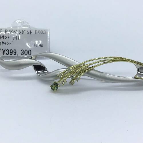 | コメント | プラチナの捻りのデザインが女性らしい優しいフォルムになっています。ゴールドの湾曲された部分には、アレキサンドライト1石とダイヤモンドが6石施された、おしゃれなペンダントトップです。ブローチとして2Wayでも使えます。鑑別書付き。 |