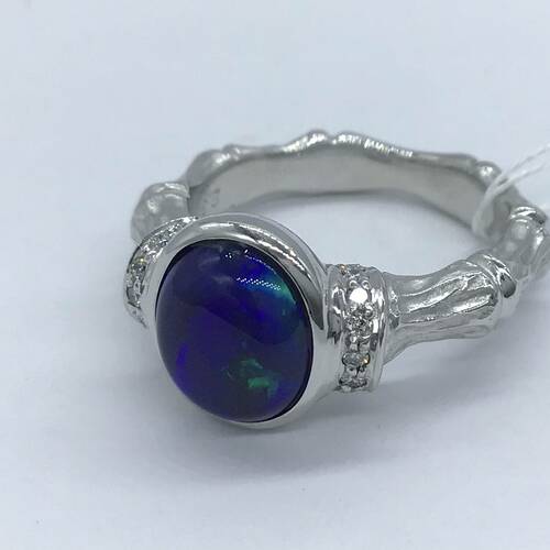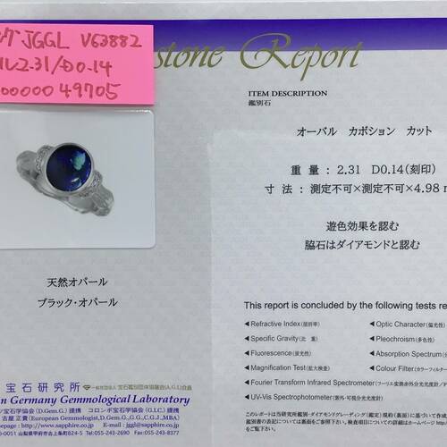 | コメント | 10月誕生石のオパールの中でもブラックオパールは不透明な黒から濃い灰色を地色としています。深海のような濃いブルーの中に角度によってグリーンが見えたりと幻想的な宝石です。鑑別書付き。 |