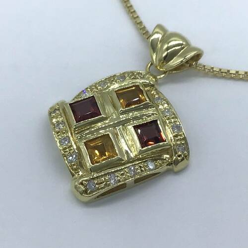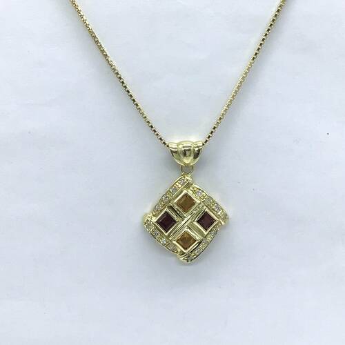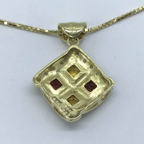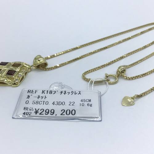| コメント | 回りにダイヤモンドで囲まれ、ガーネットとシトリンが2石づつ施されたおしゃれなネックレスです。スライドアジャスターにより長さ調整可能。 |